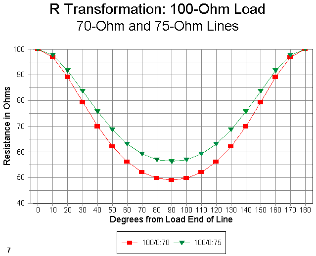 Before we turn to the SWR curve, let's look at the use of 70 or 75 ohm cable as a match between 50-ohm line and resistive loads of about 100 ohms. (We shall remain at 28.5 MHz throughout this section.) The 70- ohm line will match a 100-ohm resistive load to 50-ohm line almost perfectly, while--as shown in Figure 7--the 75-ohm matching section is not sufficiently far off the mark to make us worry for a second.