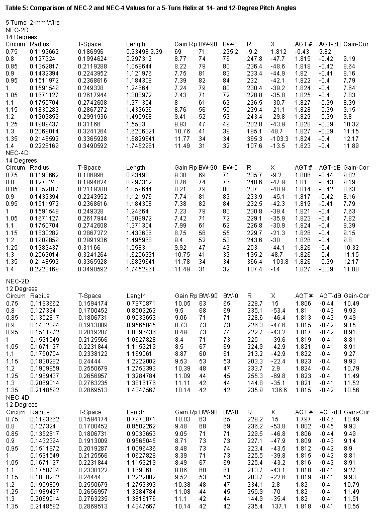 The key question is whether we can expect any significant differences in the reported output between NEC-2 and NEC-4. Table 5 provides a negative answer with respect to 5-turn helices using 2-mm diameter wire for pitches of 14° and 12°. (The table repeats the data from Table 1 to facilitate the comparison.) I ran the series using the sample model shown and with the additional EK (extended thin-wire kernel) command that is useful in NEC-2 when the segment length begins to approach the wire diameter. The EK command made no difference to the data output. This test also confirms that the chief source of low AGT values is the position of the source and the orientation of the wire segment on which it is placed. The bottom line is simply that NEC-2 is fully adequate for modeling axial-mode helices so long as the modeler uses the AGT value to correct the gain reports and recognizes the limitation inherent in the source impedance report.