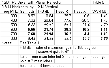 Past studies of planar reflectors indicate that for the normal range of driver assemblies (all 2-dimensional), variations of reflector dimensions did not equally affect both the forward gain and the front-to-back ratio. Peak gain occurs at a reflector size that is below the optimal E-plane (vertical) dimension that yields the best front-to-back ratio. Both dimensions contribute to the front-to-back ratio, but the vertical dimensions seemed more pronounced in its effect. Whether we can make a similar differentiation with the P3 is an interesting question. Therefore, let's begin again with the large reflector (Table 3) and see what results from changing only one of the dimensions at a time.