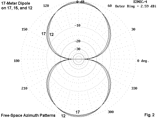 Fig. 2 compares the patterns for a 17-meter dipole in free space in the three desired bands. Operationally, the differences in patterns would not be detectable.