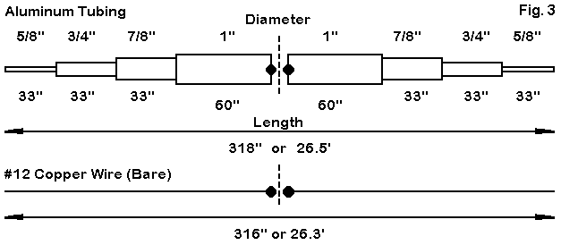 Notice that the thinner wire dipole is actually shorter than the aluminum tapered diameter element. The particular set of element diameters and section lengths used in the tubing model actually is equivalent to a uniform diameter tube about 0.8" in diameter and 310" long. Tapering element diameters downward towards the outer ends calls for longer physical lengths longer than uniform diameter tubes.