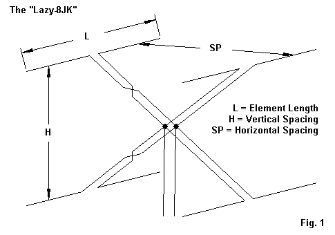 Therefore, I have dubbed the array the "Lazy-8JK." This name is very much shorter than calling the assembly a collinear, broadside, endfire array. The latter expression is descriptive, because the top and bottom elements form pairs that are endfire arrangements, while the left and right pairs are broadside arrangements.