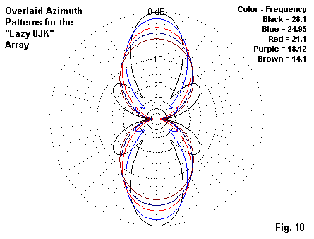 From the perspective of gain, then, there are two considerations facing the builder who may weigh the increase in construction complexity against the performance advantage. First, the more complex array shows a better balance of gain than a single Lazy-H, with improvements especially in the 20-meter performance. Second, the Lazy-8JK increases gain on the upper bands over the sampled standard 8JK array. Whether the total improvement is sufficient to warrant the increased construction problems is ultimately a user judgment.
