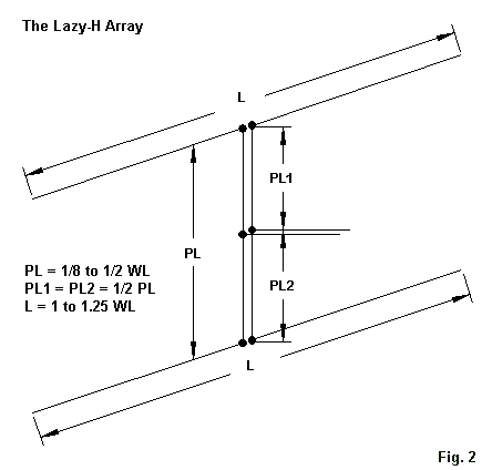 In its basic form, the Lazy-H is a very old but well-proven antenna design with distinct advantages among wire arrays. Originally, it consisted of two 1 wavelength elements vertically spaced 1/2 wavelength apart. However, users later discovered that the antenna would operate effectively over a wide frequency range using a parallel transmission line and a wide-range antenna tuner.