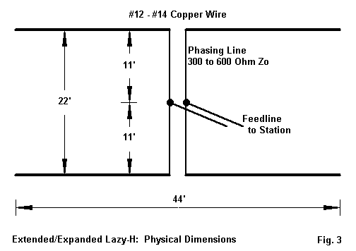 The version that we shall explore uses the same wire lengths and spacing as the Lazy-H in Fig. 3. The only differences are the fact that the antenna is placed in a horizontal position and there is a half-twist in one (and only one) of the phase lines from the common junction to the elements. Since the Lazy-H has elements at both 44' and 66' above ground, we shall sample performance on 20 through 10 meters at each of these heights.