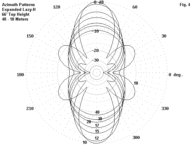 Fig. 3 shows one common form of the Lazy-H that is useful for operation on amateur bands from 10 meters down to 40 meters. On 10 meters, the 44' wires are about 1.25 wavelengths, dropping to 1 wavelength on 15 meters, and becoming progressively electrically shorter as we reduce frequency. The 22' spacing is 5/8 wavelength on 10, 1/2 wavelength on 15, and electrically closer on lower frequencies. We shall use this model as a foundation for this evaluation of the Lazy-8JK in order to provide a consistent set of dimension throughout. In addition, we shall place the bottom wire of the Lazy-H at 44', with the top wire at 66'. With these dimensions and heights, we obtain the performance in the following table.