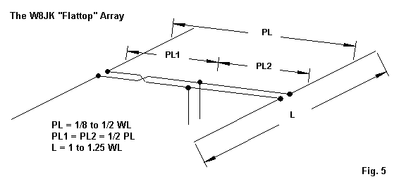If we look carefully at the sketch, we can see that the array in Fig. 1 only becomes a collection of collinear elements when the element lengths approach and pass beyond the 1 wavelength mark, at which time, we can consider them to be collinear half wavelength elements. The vertical dimensions surround those that we associate with the Lazy-H antenna. If we look carefully at the sketch, we can see that the two left-side elements are in phase with each other, since the lines to each left-side element have half-twists. Likewise, the right-side elements are also in phase with each other. The 2 top elements are out of phase with each other, the sign of a W8JK array. Likewise for the bottom 2 elements. Of course, all of this assumes that all 4 lines from the central junction are equal in both length and characteristic impedance.