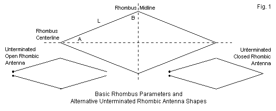 The rhombic antenna derives its name from its shape: the rhombus. In geometry, a rhombus is an equilateral parallelogram, that is, a closed 4-sided figure with all sides the same length, but with all corner angles normally using other than right angles. Fig. 1, at the top, shows a basic rhombus, with indications of the key dimensions.