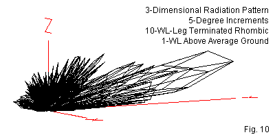 Fig. 10 provides a 3-dimensional pattern for the rhombic with 10 wavelength legs. It reveals that the terminated rhombic exerts the most control over the morass of small lobes that populate the overall radiation pattern. You may directly compare this pattern with the one in Fig. 4 for the unterminated rhombic to correlate various lobes and their relative strengths. As well, you may compare it with corresponding patterns for other terminated long-wire arrays in earlier parts of this series.