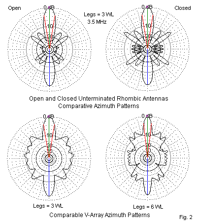 Despite the existence of a reasonably plausible claim that all rhombics are terminated to one or another degree, we shall adhere to the common referential terms. Without a mid-range non-inductive resistor at the far end of the antenna, the rhombic will be unterminated in either the open or closed configuration. The chief difference between the open and closed versions of the unterminated rhombic antennas lies in the sidelobes, not in the small differences in gain and inherent front-to-back ratio that is a part of all end-fed long-wire antennas. Fig. 2 contrasts the structure of the sidelobes for open and closed unterminated rhombics. Note that the closed version shows larger sidelobes than the open version, suggesting less complete cancellation of lobes from the parallel legs.