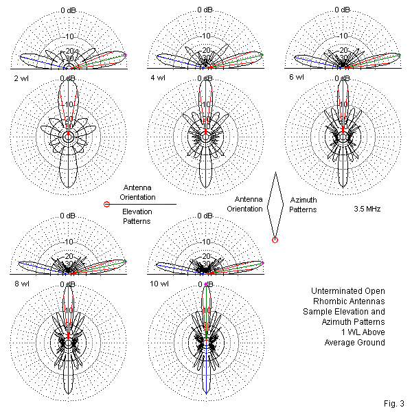 Fig. 3 presents the unterminated rhombic gallery of sample elevation and azimuth plots for leg lengths of 2, 4, 6, 8, and 10 wavelengths. By comparing the plots with Fig. 2, you can verify that the gallery uses the open version of each rhombic.