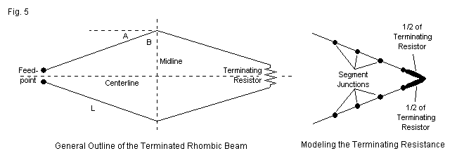 The models for the unterminated rhombics have used only 4 wires, one for each leg. The model source consists of a split source, that is, two sources in series. The sources go on the segments adjacent to the junction of the wires at the feedpoint end of the antenna. As the right side of Fig. 5 reveals, I used a similar technique to place the terminating resistor. Non-reactive resistive loads go on the last segment of each far-end wire, with each resistance equaling half the total terminating resistance. These techniques of placing sources and loads preclude the need to create a short wire at each end of the rhombic structure. To preserve an equality of segment lengths, the bridge wire would have to be long enough that it would not preserve the value of angle A. Alternatively, to maintain the value of angle A, the source/load wire would be significantly shorter than adjacent leg segments, a condition on the source wire that NEC does not recommend for the most accurate calculations. Split sources and split loads preserve both the geometry of the model and the best conditions for calculation.