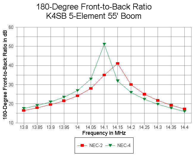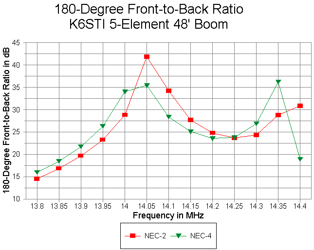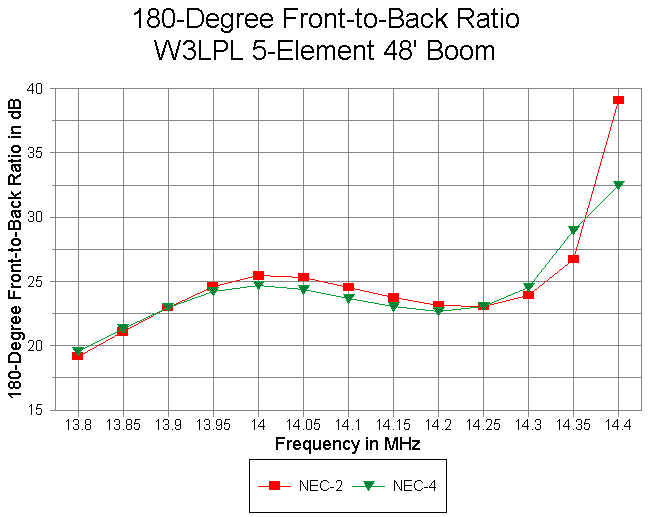 The W6NGZ model is the shortest of the five, but it sustains a free space gain of over 10 dBi across the band, with better than 20 dB front-to-back ratio everywhere on 20. The element taper is from the CQ article, and it contains no compensation for element mounting plates at the element center. Within these constraints, NEC-4 and NEC-2-corrected tell very similar graphical stories about the beam. Differentials are marginal at best, although a wee bit of excess gain estimation and a slide of the curves downward in frequency are both evident.