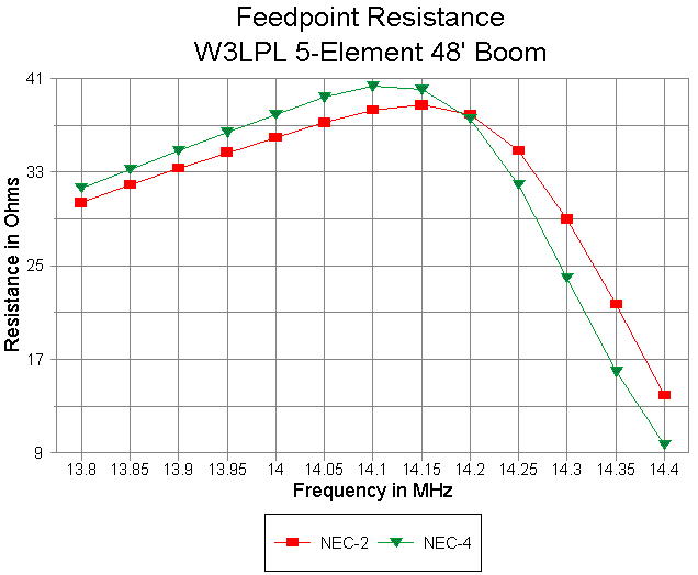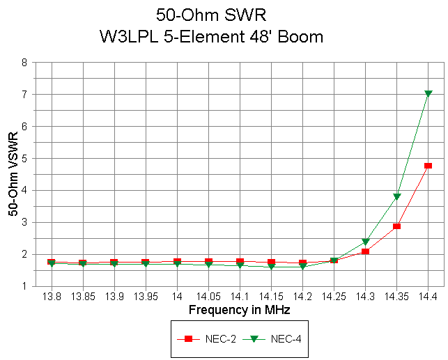 The W3LPL beam was designed for use with a Tee match, which neither NEC-2 nor NEC-4 can physically model accurately. Interestingly, W3LPL designed the antenna with non-conductive boom-to-element mounting plates in mind. Nonetheless, the curves--plus a look at the antenna characteristics just below 14 MHz--suggests that there is an approximate 50 kHz offset in frequency, with the elements in the model again playing short in the NEC-4 run, relative to the NEC-2-corrected run. Gain is still a little high in NEC-4. Given the W6NGZ model runs, this much difference is somewhat unexpected. The chief difference in the modeled data is that the W3LPL antenna shows considerable and constant inductive reactance, due to its intended use with a Tee-matching system.
