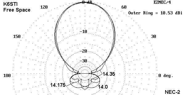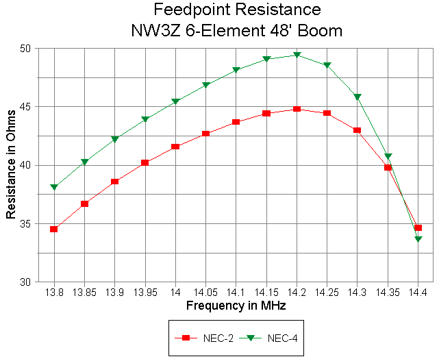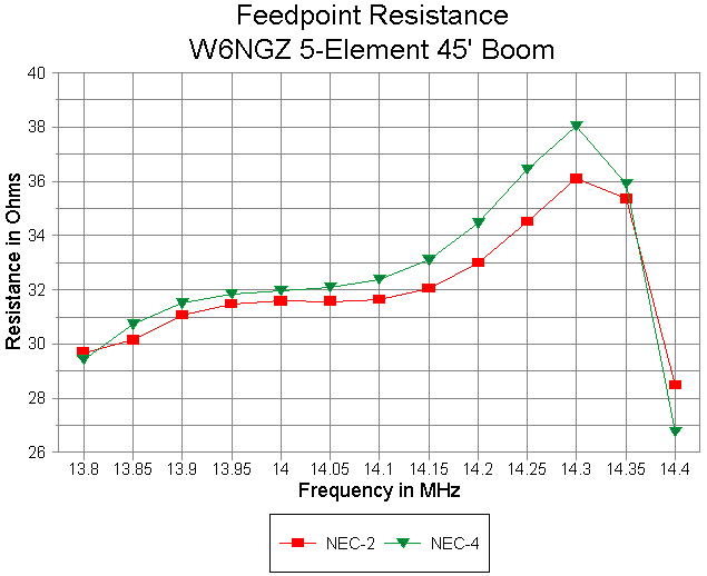 As with all other designs, NEC-4 tends to overestimate gain and move the performance characteristics lower in frequency relative to NEC-2 curves. Since this model uses a 96" constant diameter center section in each element, the effect is not too extreme, but still greater than for the W6NGZ design.