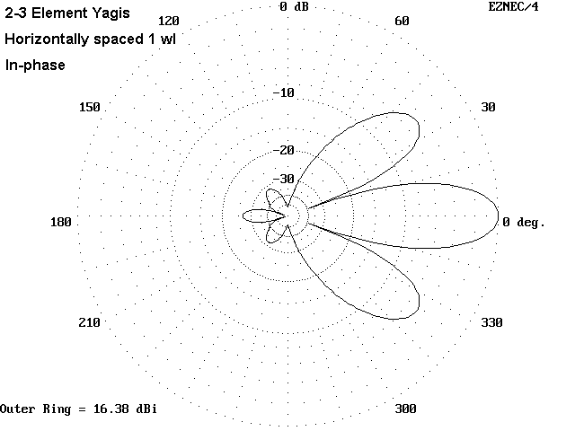 And that is using only 3-element Yagis as the foundation. There is no reason to believe that results for larger individual beams cannot be extrapolated with reasonable reliability--or that 5/8 wl spacing will not show similar small gains above 1/2 wl spacing. In the latter case, however, phase reversal patterns might differ, since beam interaction differs a bit.
